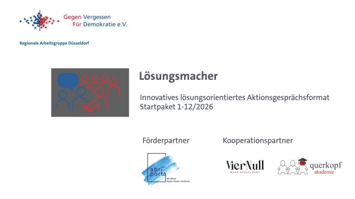 In Düsseldorf kooperieren die Querkopf Akademie, der lokale Newsroom VierNull und die Regionale Arbeitsgruppe von Gegen Vergessen – Für Demokratie e.V. seit 2025.
