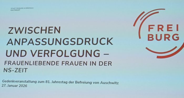 Während die Israelitische Gemeinde am Gedenkabend mit spannenden Gästen wie dem israelischen Historiker Gideon Greif darüber diskutiert, wofür Auschwitz heute steht, setzt ein breites Bündnis unter der Regie des städtischen Kulturamts auf ein lange vernachlässigtes Forschungsthema: „Frauenliebende Frauen in der NS-Zeit“. Wie immer ist der Kaisersaal im Historischen Kaufhaus so voll, dass viele weitere Interessierte weggeschickt werden müssen. Im Vergleich zu den Vorjahren sind diesmal besonders viele Frauen – darunter zahlreiche sehr junge – im Publikum. Und der große Applaus am Schluss, als Sozialbürgermeister Ulrich von Kirchbach betont, die Veranstaltung setze „ein Zeichen für die Sichtbarkeit queerer Menschen“ und die Offenheit Freiburgs, beweist: Viele empfinden diese Offenheit als bedroht.